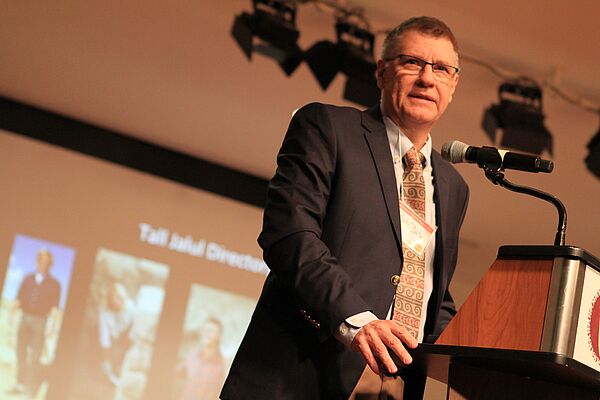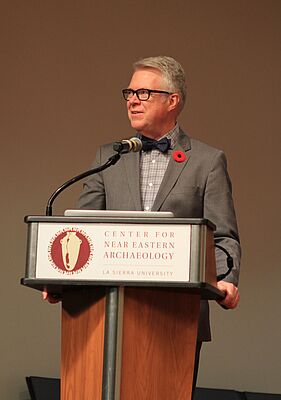 <p>La Sierra University President Randal Wisbey welcomes the audience for the 10th Annual Archaeology Discovery Weekend celebrating 50 years of excavations in Central Jordan.</p>