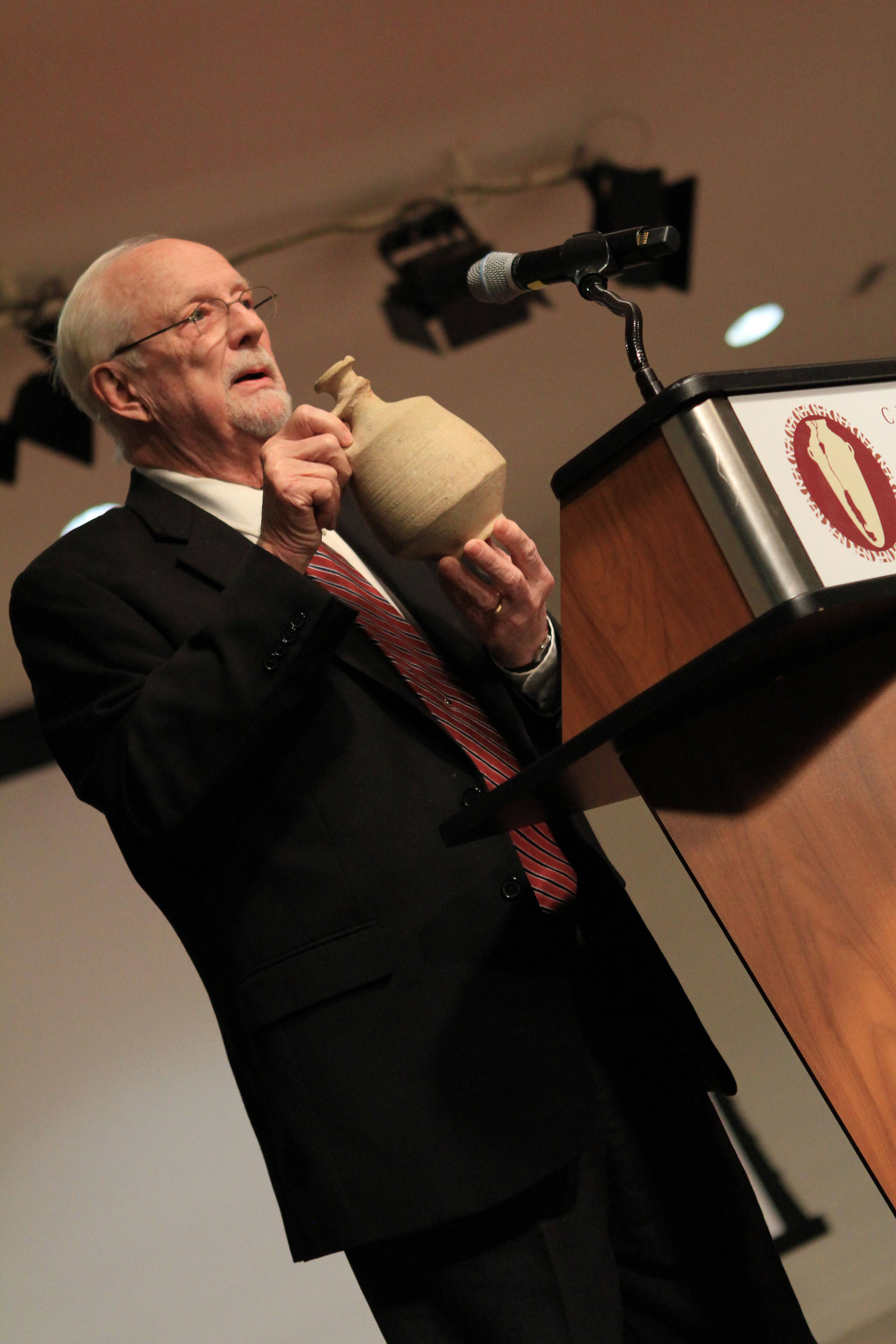 <p>Eminent archaeologist Bill Dever gives a keynote presentation and displays an artifact during the 10th Annual Archaeology Discovery Weekend.</p>