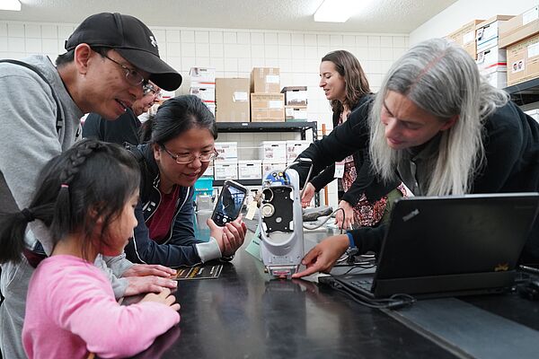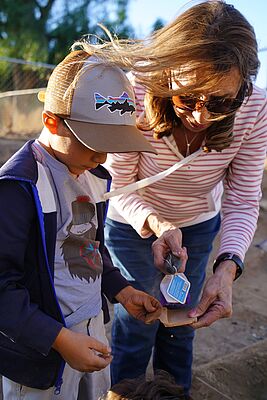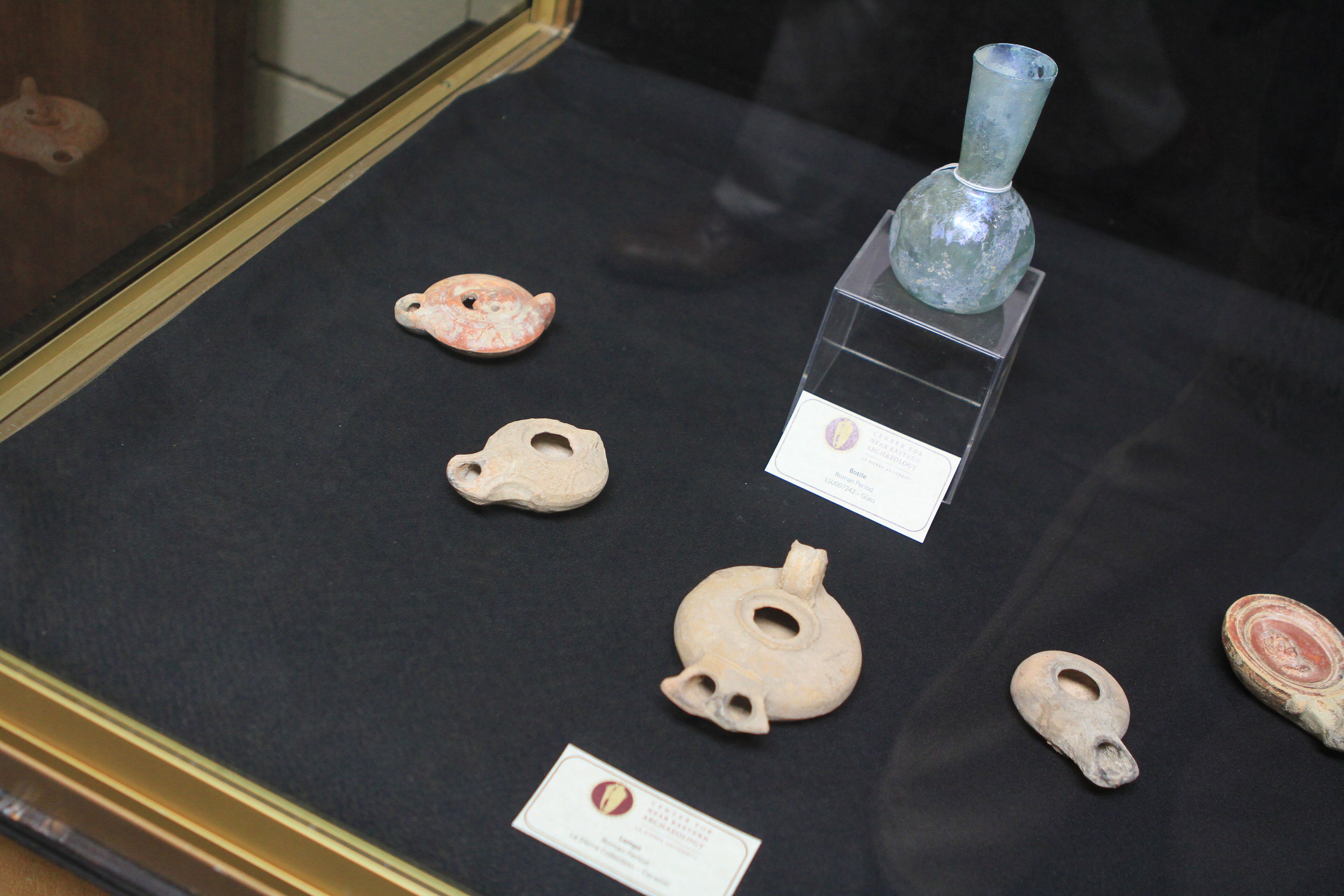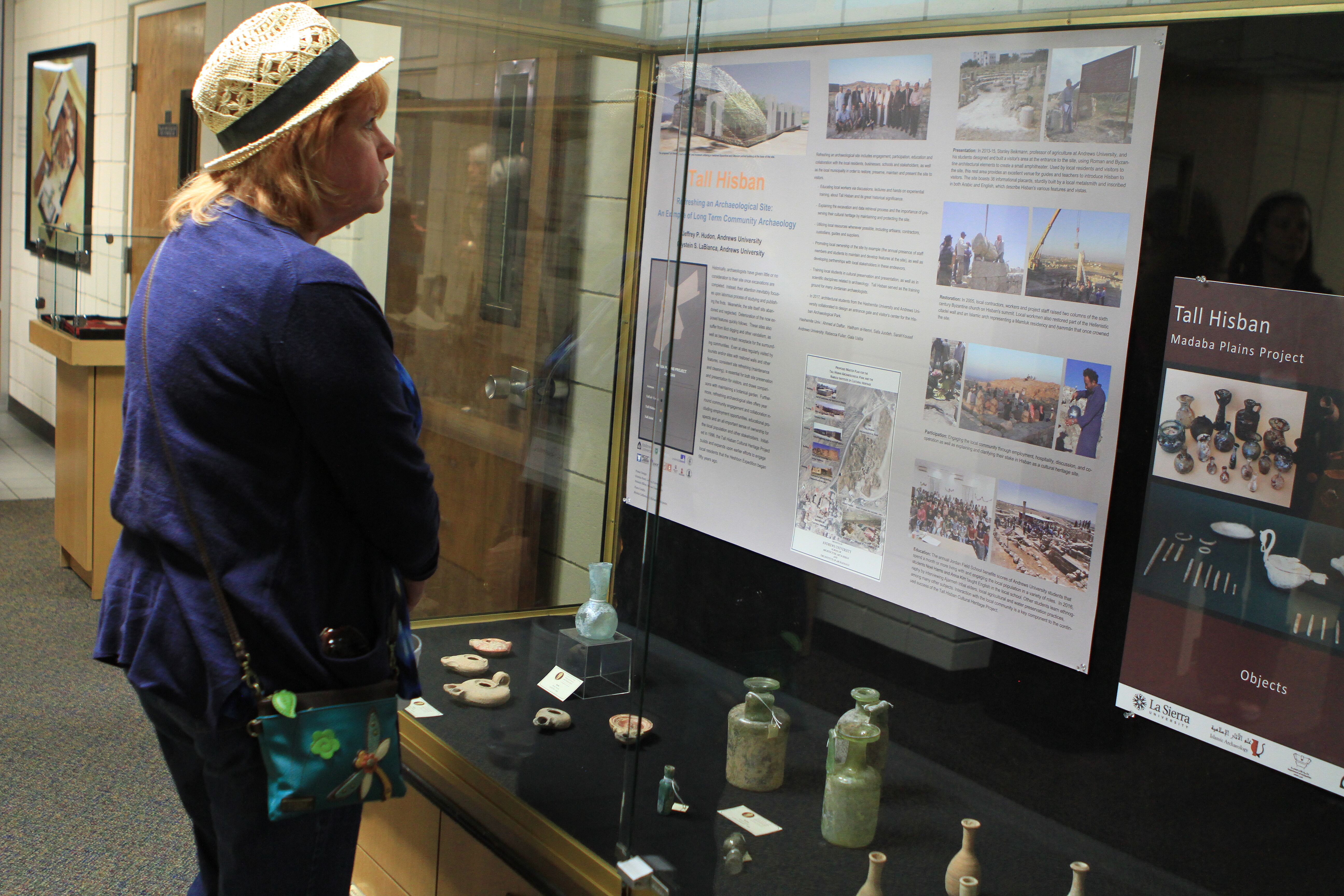 <p>An attendee of Archaeology Discovery Weekend views a display of ancient artifacts at the Center for Near Eastern Archaeology.</p>