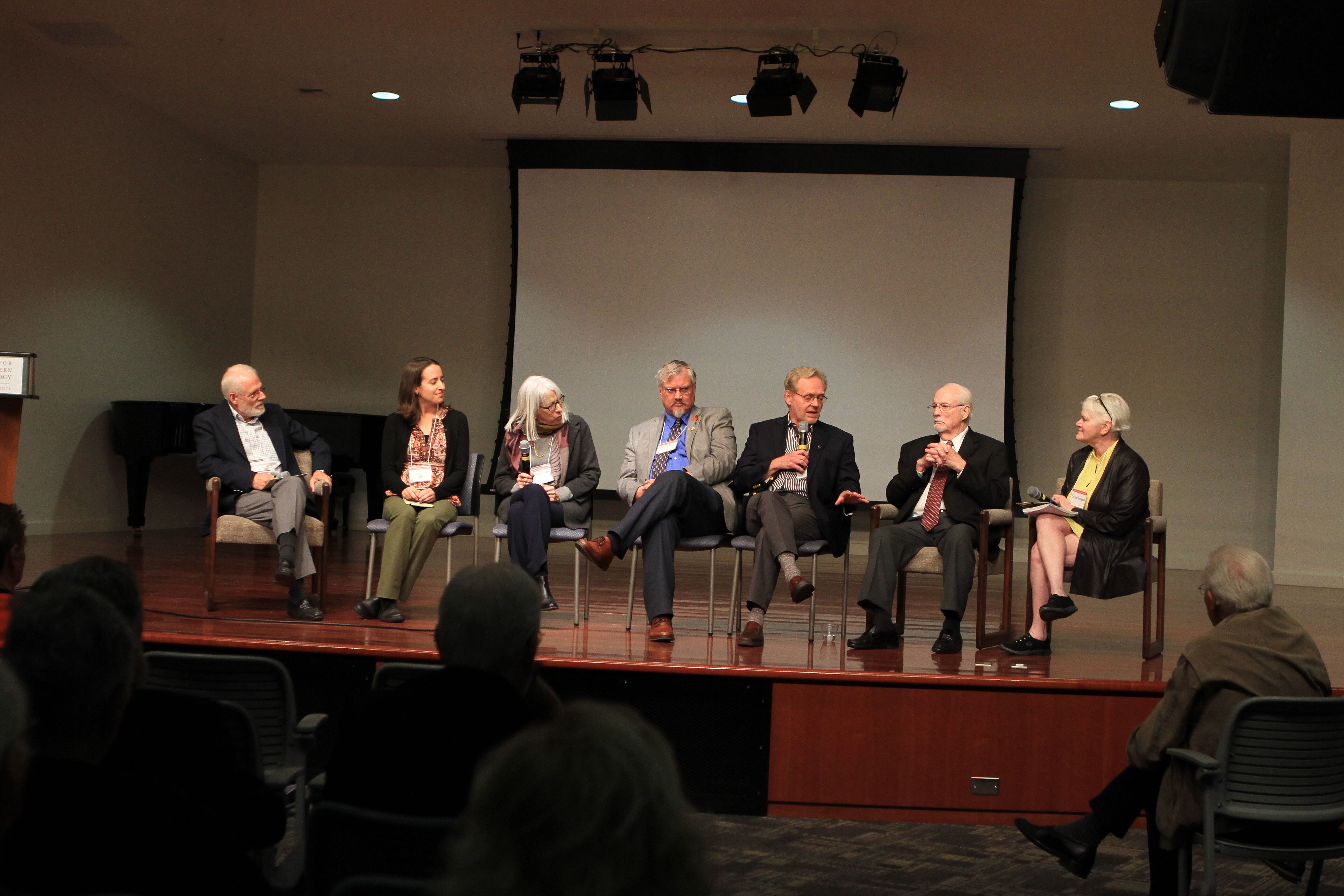 <p>Archaeology Discovery Weekend included a panel discussion by noted archaeologists and scholars (left to right) Doug Clark, Monique Vincent, Beth Alpert Nakhai, Tom Davis, Østein LaBianca, Bill Dever, and Susan Ackerman.</p>