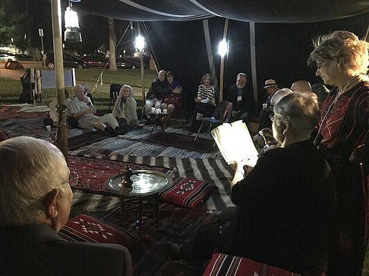 <p>Saturday evening featured a reception and reading in a goat hair Bedouin tent set up outside the archaeology center, outfitted with Middle Eastern furnishings, snacks and tea.</p>