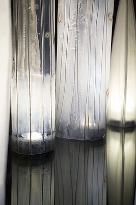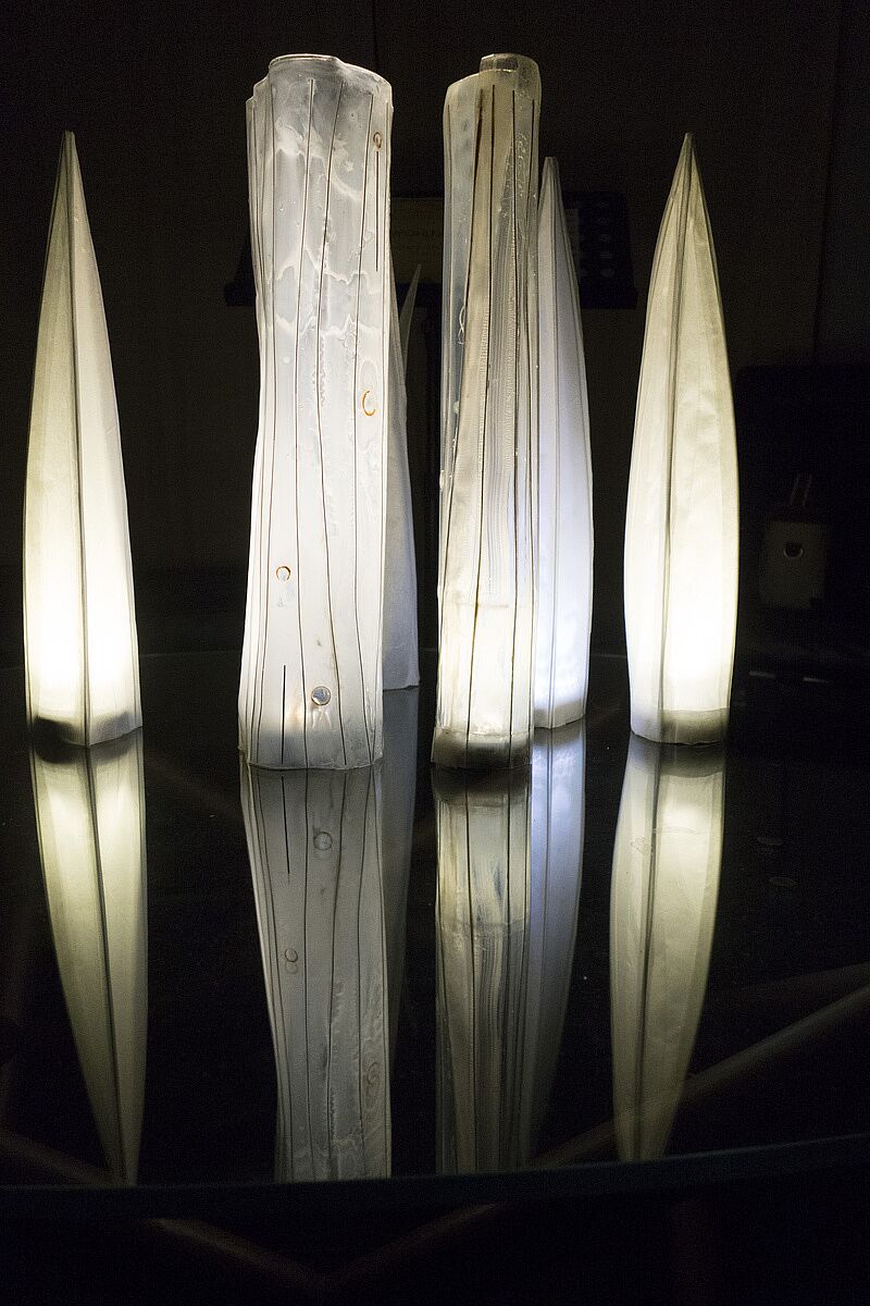 Each of the light sculptures is formed out of translucent layers of material overlaid onto a framework of metal wires that provides support. “This light tower is a metaphor for how our beliefs are formed and shaped. The metal rods represent our core beliefs, and what we value in life. These rods are embedded in us by our family, culture and religion. We wrap our identity of who we are onto this framework of understanding,” said Thomas.