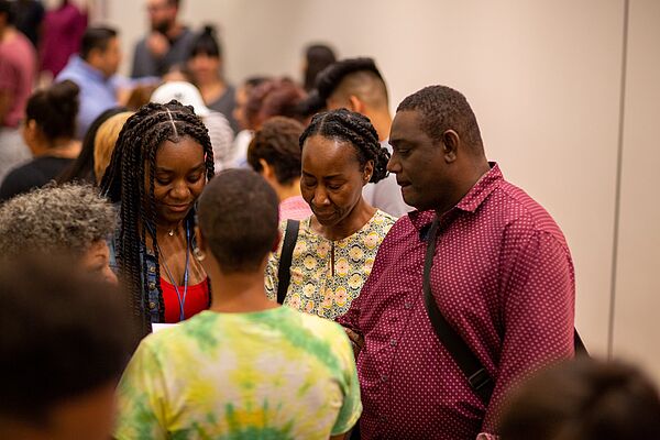 <p>Faculty and staff pray with freshmen and their families during the Ignite Blessing service on Sept. 18 at Troesh Conference Center.</p>