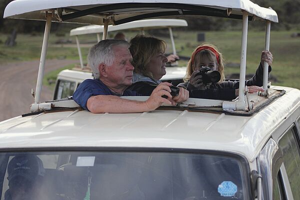 Karen and Dennis, along with Sandra Northey, on a game drive on the Masai Mara in Kenya. The roofs of the safari-style vans lifted up so passengers could stand to view the diversity of flora and fauna. (Photo courtesy of Glen Hutton)