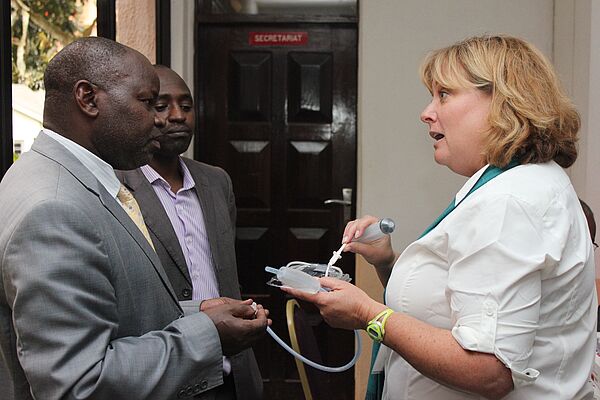 Karen Hansberger explains the Bakri uterine balloon to an OB/GYN physician and hospital superintendent at Nanyuki hospital in Kenya. (Photo courtesy of Glen Hutton)
