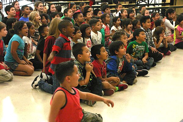 Youngsters at Stokoe Elementary School react to the colorful sight of games, art supplies, an LED television, volleyballs, basketballs and other sporting goods arrayed on a stage.
