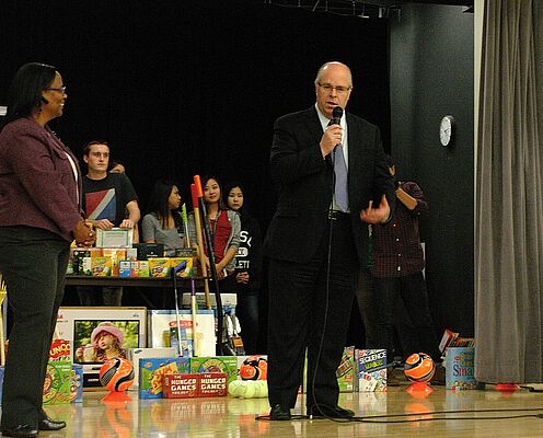 The goods were unveiled during a special assembly on Dec. 9, and were purchased with $3,909.49 raised during the fall academic quarter by 14 La Sierra University Senior Project business students led by Jere Fox, an associate law and management professor at the Zapara School of Business. The effort capped a pledge Fox made two-and-a-half years ago to Carmen Phillips, After School Programs coordinator for the Alvord Unified School District, that his Senior Project classes would raise funds to benefit all 16 Alvord After School programs. Donations to Stokoe and Wells schools this month fulfilled the promise. All told, Fox’s six classes since spring 2012 have delivered to Alvord’s 16 after school programs a total of $22,556.53 in products paid for with student fundraising efforts.