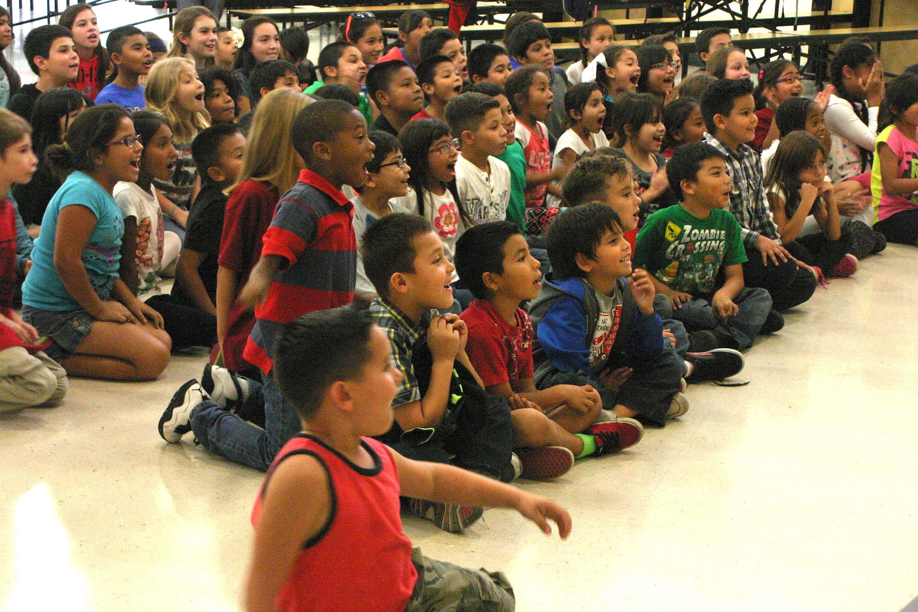 Youngsters at Stokoe Elementary School react to the colorful sight of games, art supplies, an LED television, volleyballs, basketballs and other sporting goods arrayed on a stage.