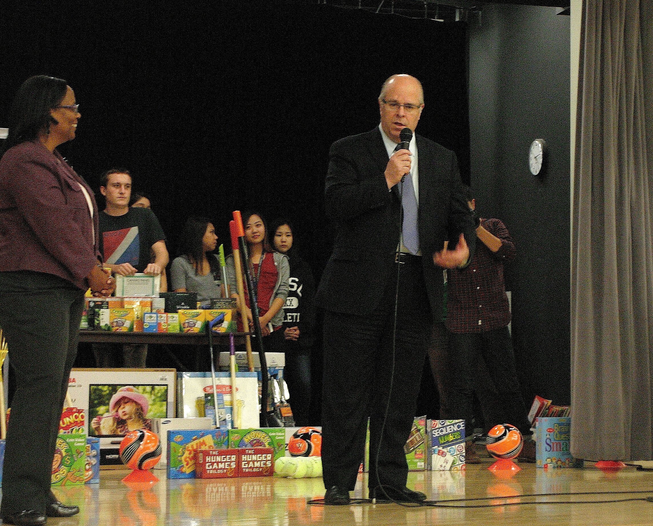 Zapara School of Business Associate Law and Management Professor Jere Fox addresses students at Stokoe Elementary in Riverside. His class raised nearly $4,000 for after school program supplies.