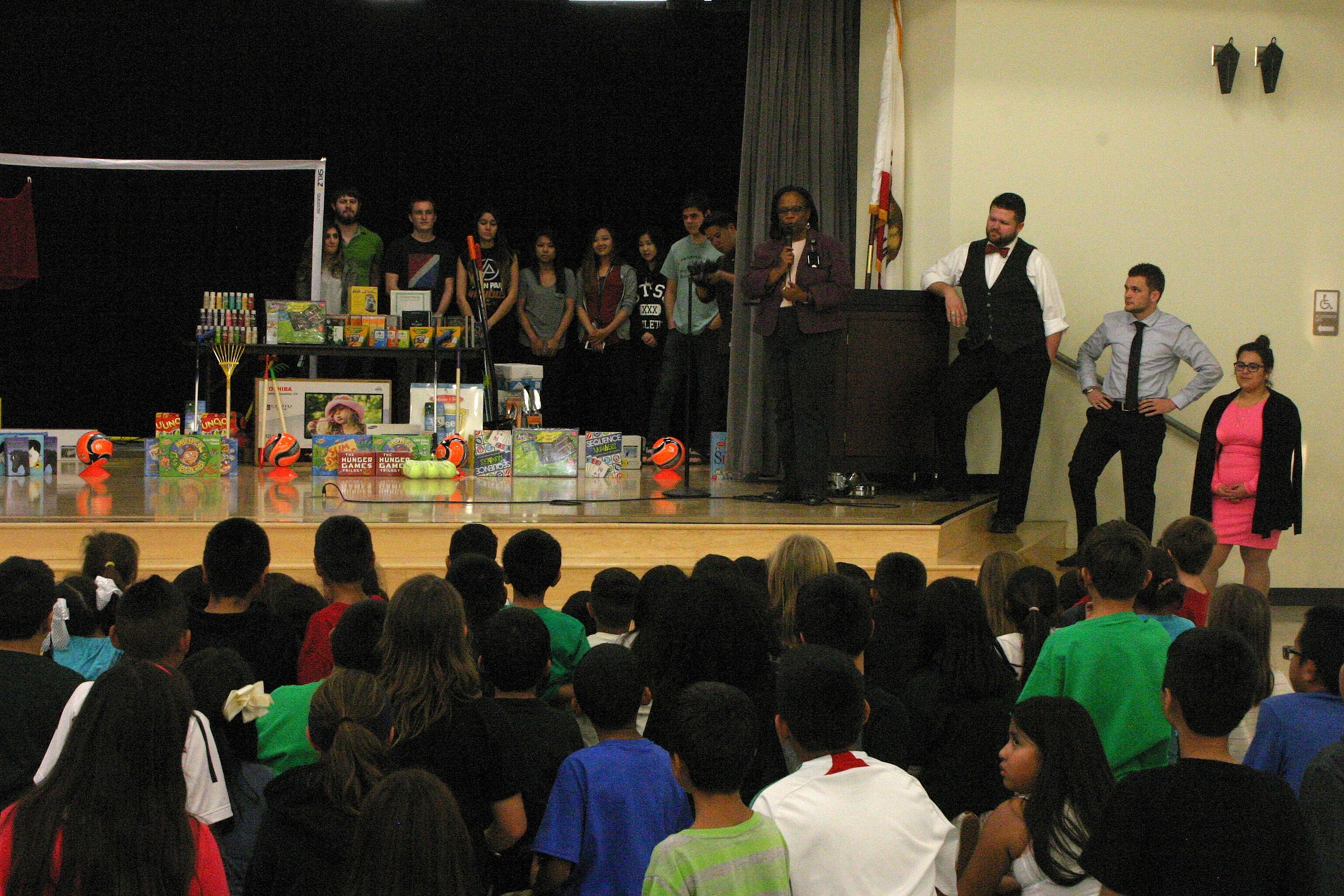 La Sierra University Senior Project students raised thousands of dollars to purchase supplies and games. They transported the goods to Stokoe Elementary for a presentation. Products will also benefit Wells Middle School.