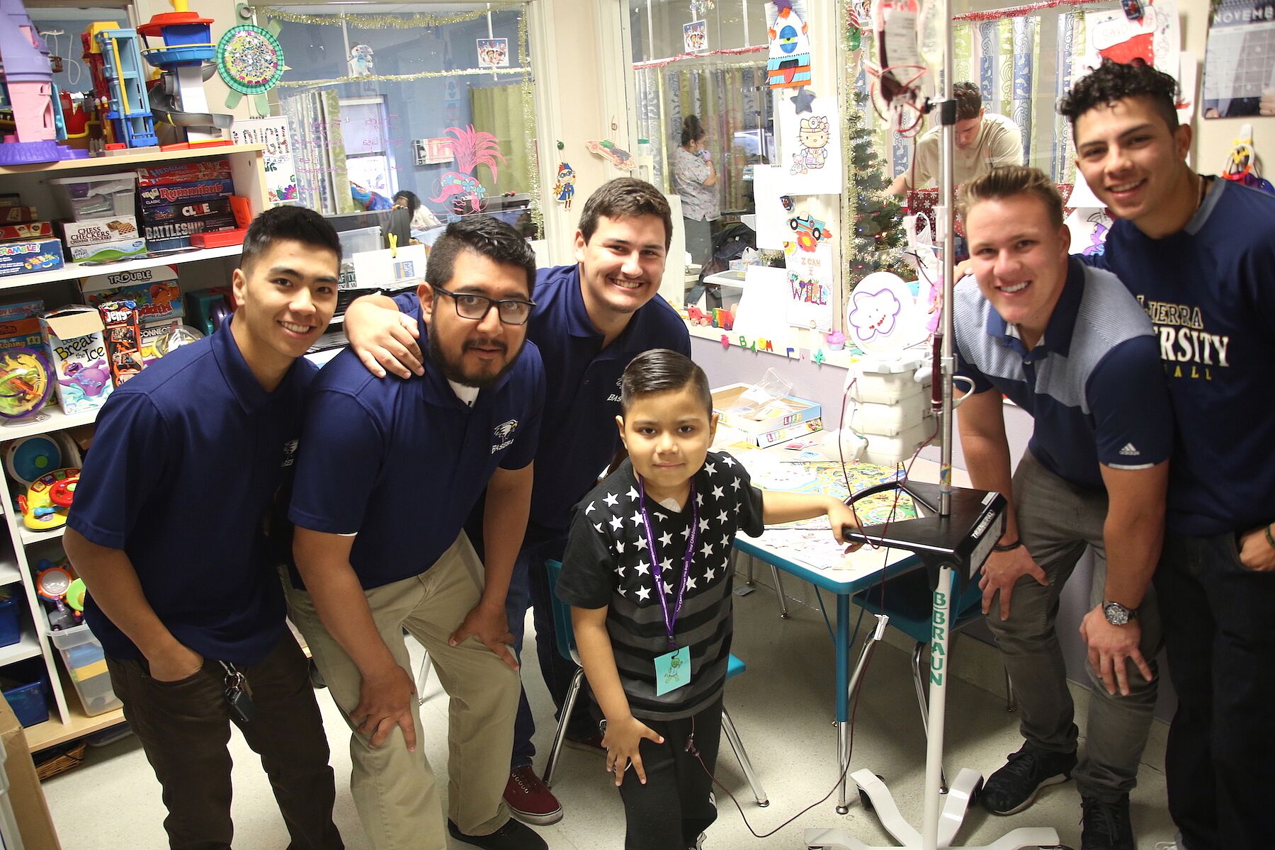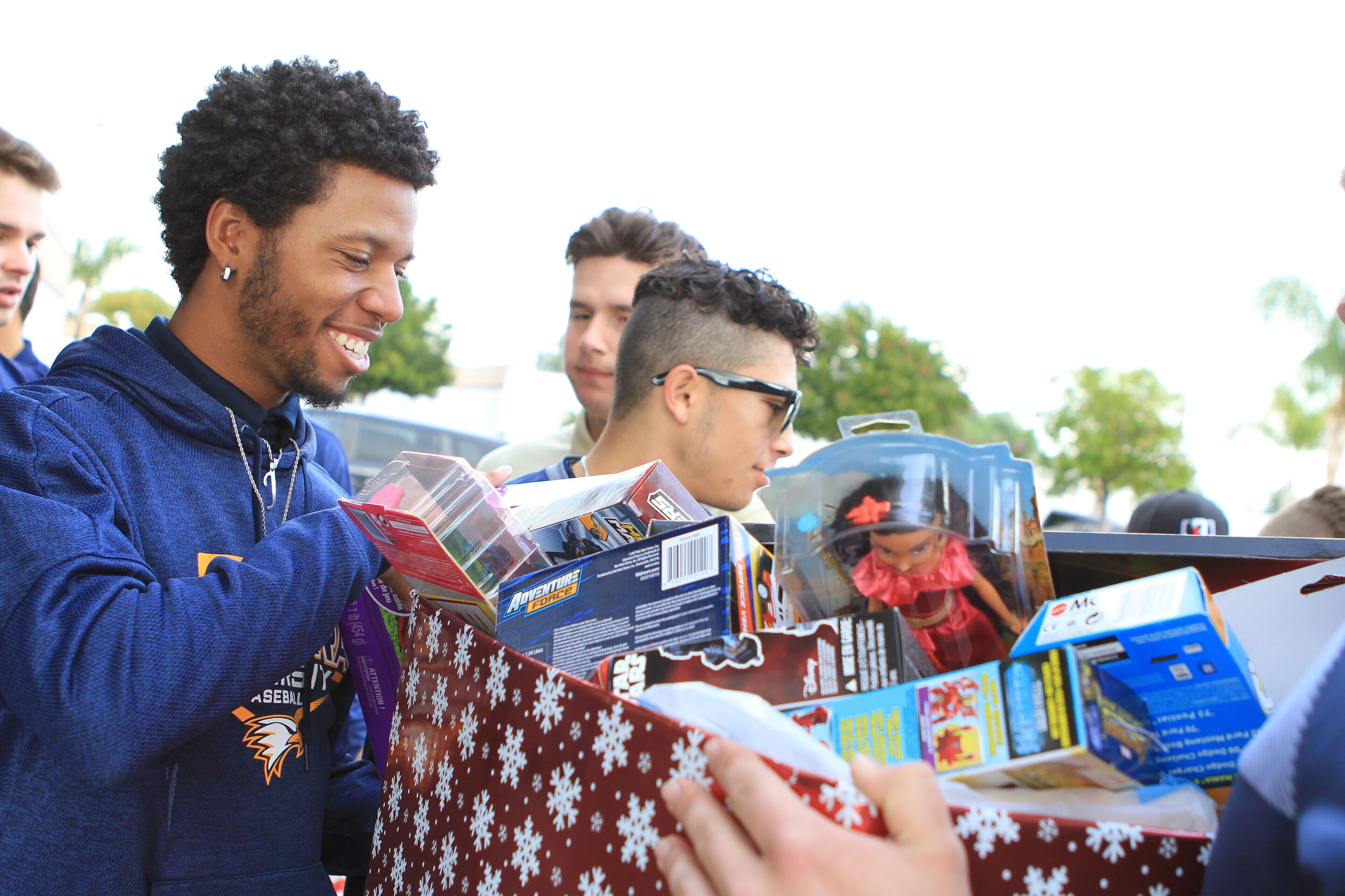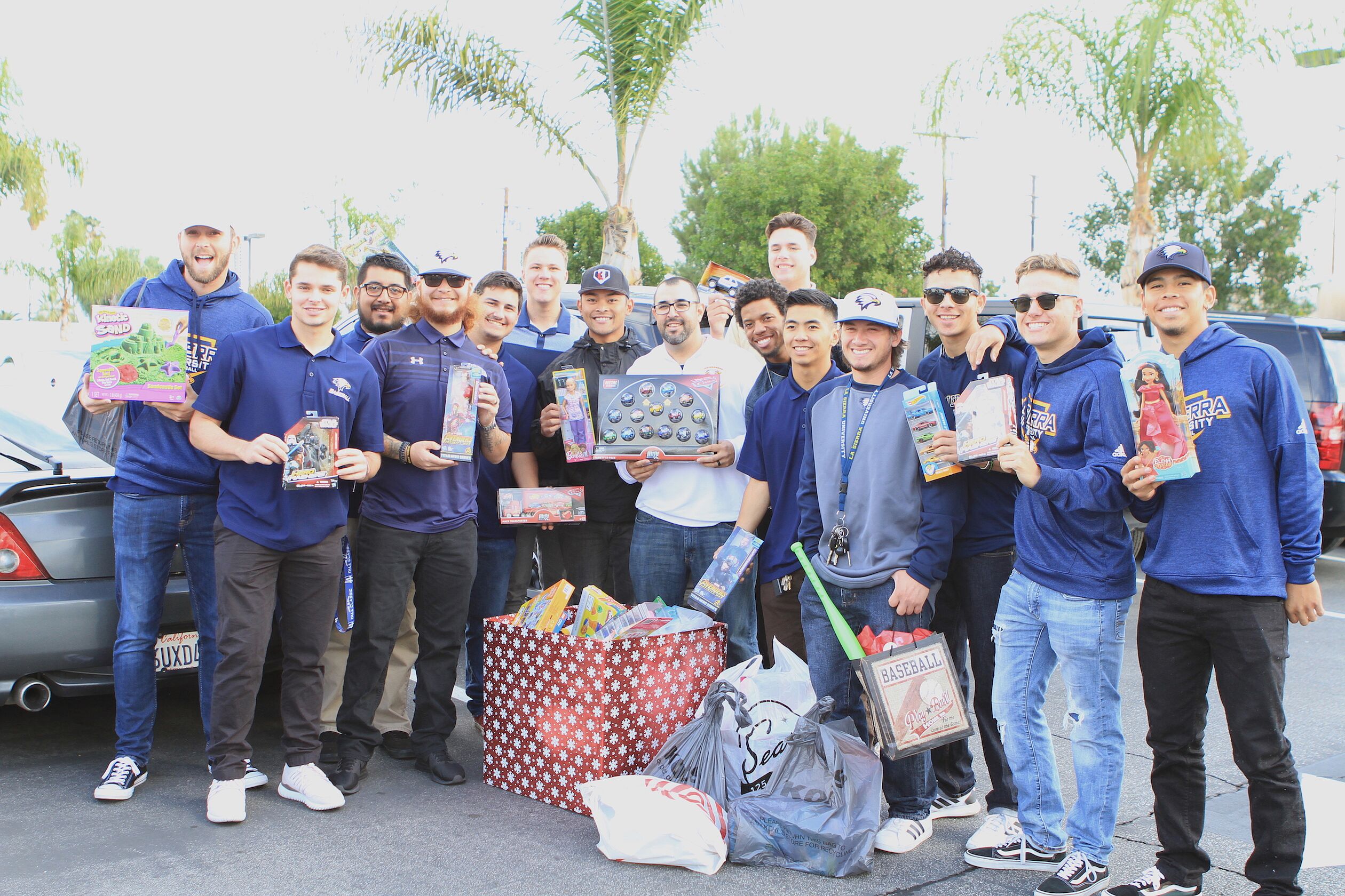 On Friday, Nov. 30, the La Sierra Golden Eagles baseball team paraded into the pediatric clinic carrying a big box decorated with holiday wrapping and overflowing with Christmas cheer – action figures, games, Barbie dolls, Legos, bubble shooters, My Little Pony figures, and many other toys. More than 100 toys altogether were donated by the campus, including more than 30 toys that were purchased and contributed by team members and their families.