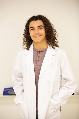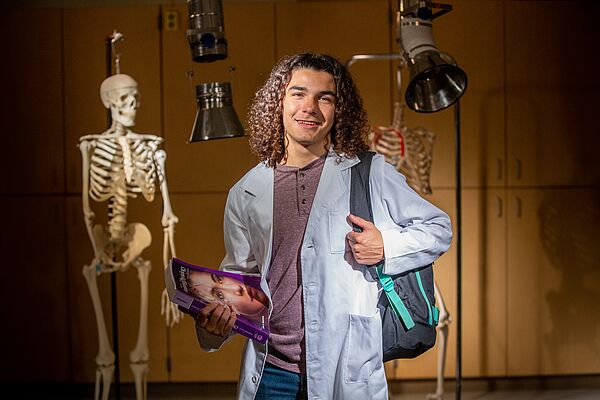 <p>Patricio Bernal, a first-year pre-orthotics and prosthetics major at La Sierra University poses in a biology lab where he has taken classes. (Photos: Natan Vigna)</p>